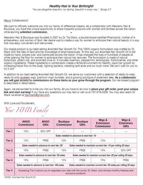 As a ShopHeavenlyHair.com partner, you have the unique opportunity to impact women across the country. Our best-selling Anointed Hair Growth Oil has helped hundreds of women grow and maintain the heavenly hair they deserve. With your partnership we will continue spreading love, hair love. As a thank you for your contribution, you will earn commission based on tiers. Upon entering the program you will be a Tier 1 collaborator. As you spread awareness of our best-selling Anointed Hair Growth Oil, you will have the opportunity to receive free gifts and will gain access to additional products like our premium virgin hair bundles, glueless wigs, merch, and more! Thank you for your interest in serving women across the country!